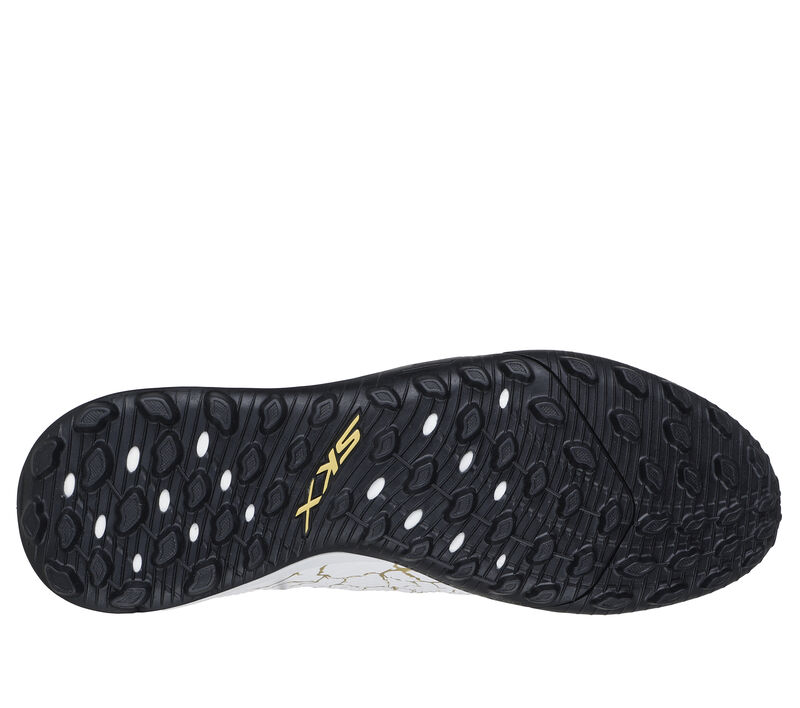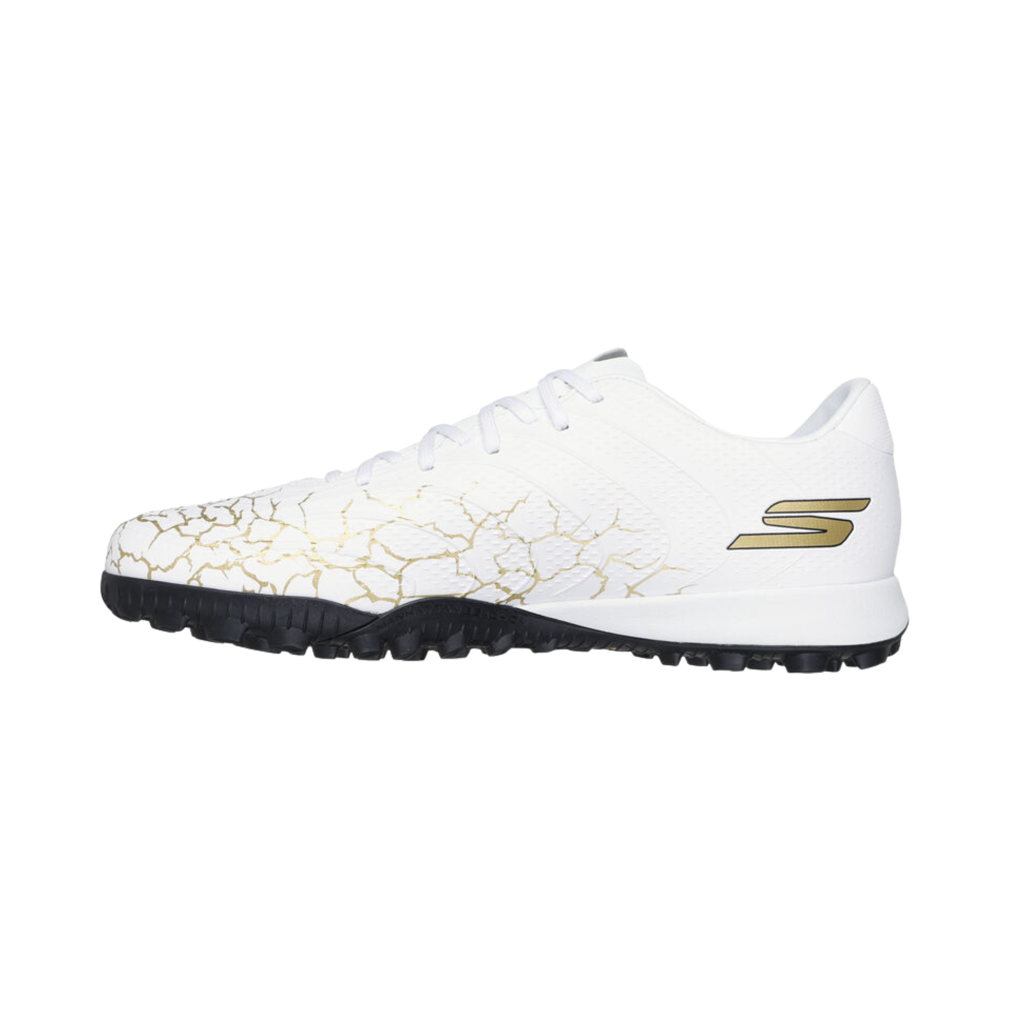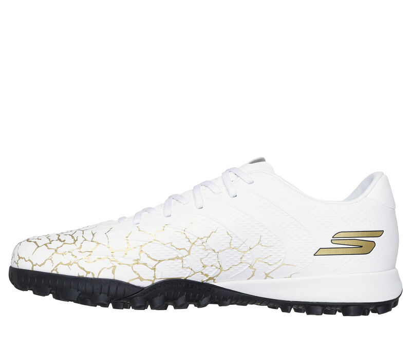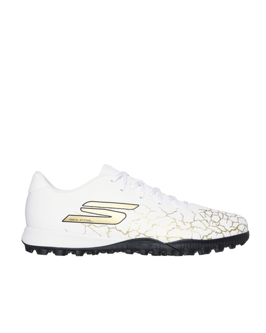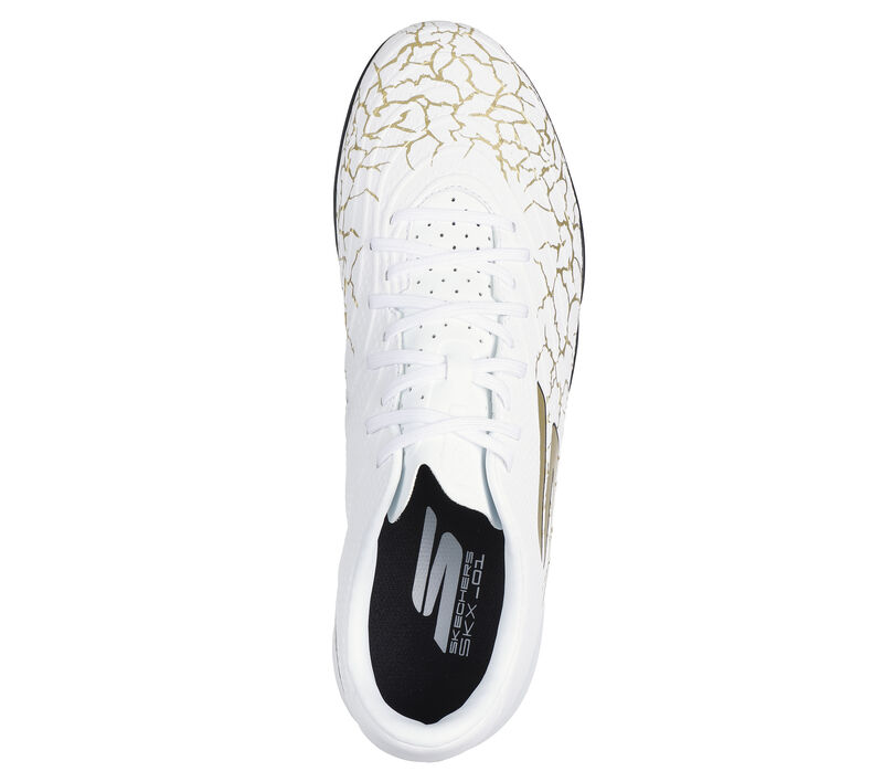 Find the back of the net with Skechers Soccer™: SKX_01 Gold TF™. This lightweight turf boot features upper molding engineered for precise ball control, with a responsive, patterned rubber bottom supporting multi-directional grip and movement, plus a soft upper and Skechers Move Foam™ cushioning for added comfort.