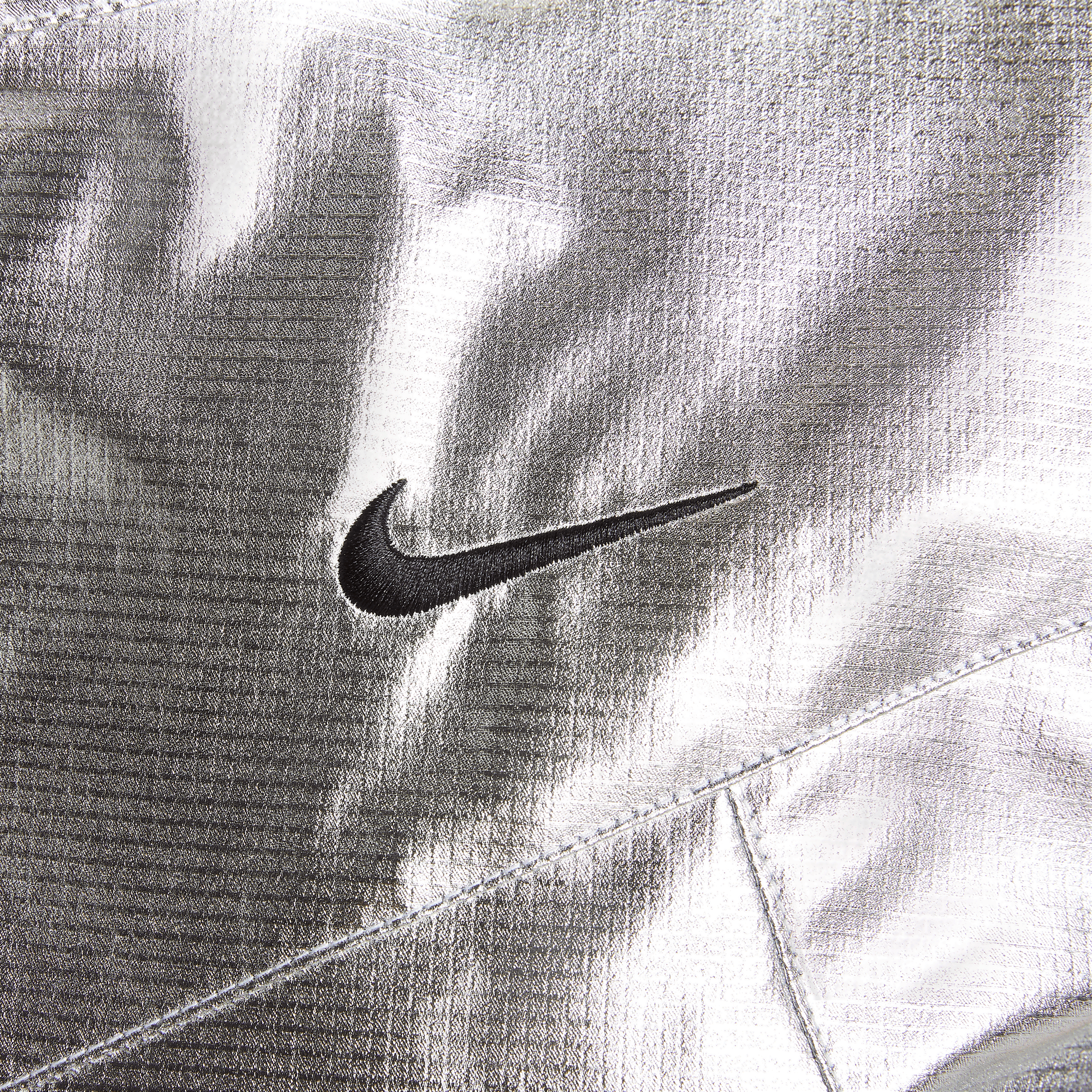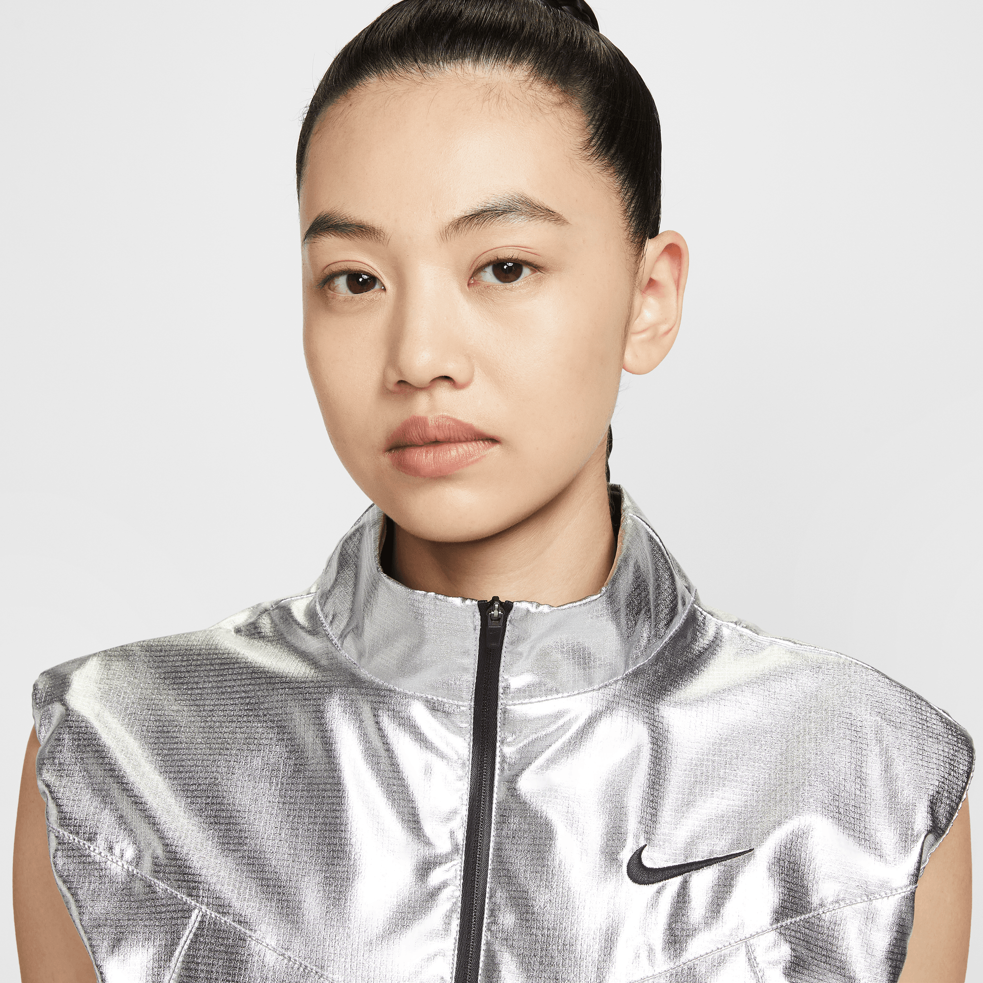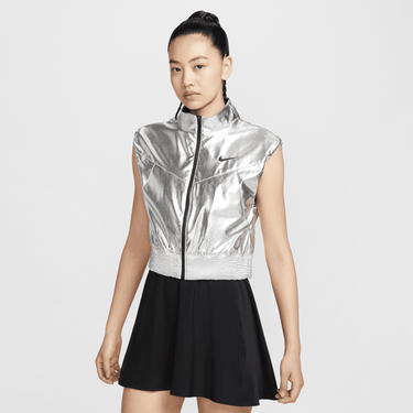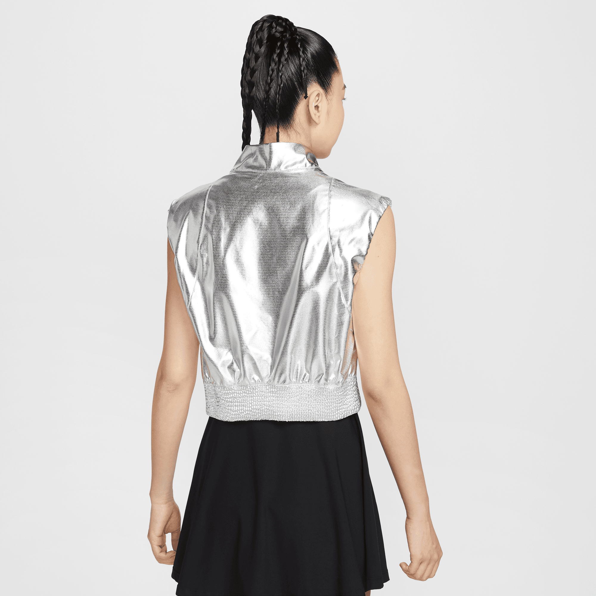 Turn heads in this eye-catching vest. Its shiny silver fabric pulls inspiration from glittering lights to celebrate the electric energy of nighttime matches in New York City.