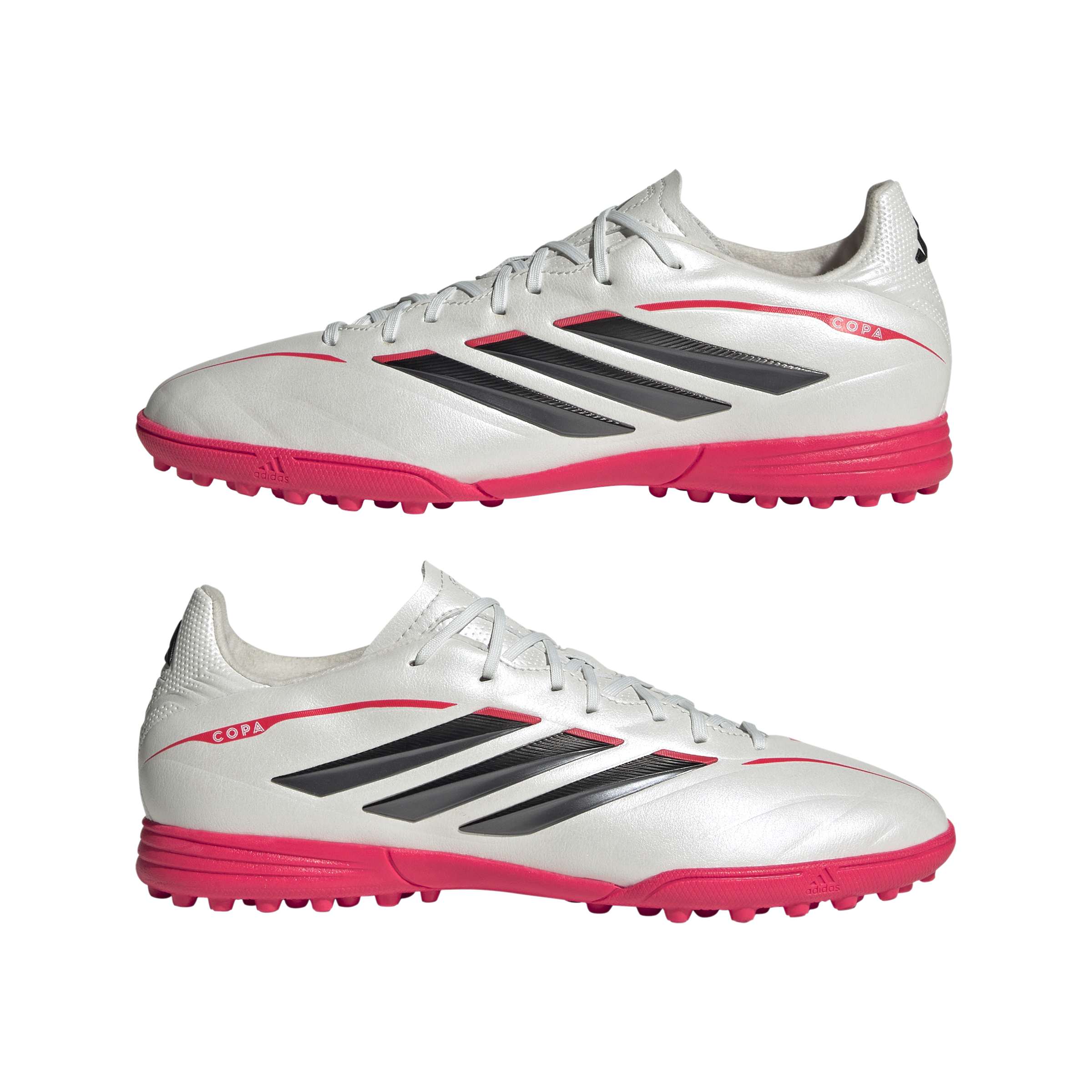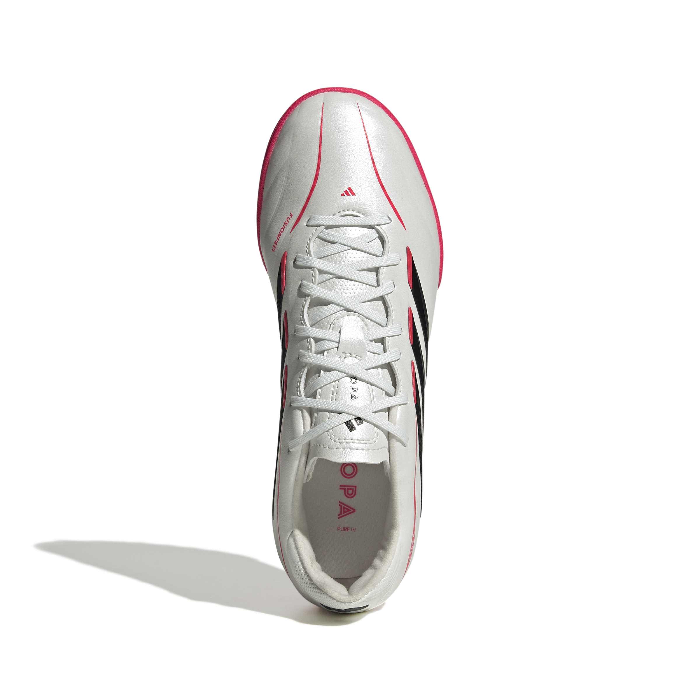 The Copa Pure IV League Turf Football Boots are crafted for young players who love the game. These boots bring a touch of class to the pitch, as well as a comfortable fit. The adidas Fusionfeel technology combines leather-like softness with strategically placed padding, providing comfort without sacrificing ball control. The 3D haptic prints support grip on the ball, which can aid precision. The rubber outsole is suitable for turf pitches, providing good traction on short-bladed synthetic fibre surfaces. The padded floating tongue on these boots decreases lace pressure to aid comfort, while the perforations can support breathability. The soft and padded heel offers comfort, making these boots suitable for long hours of play. These boots are not just footwear; theyâ€'re a gateway to a world of football enjoyment.